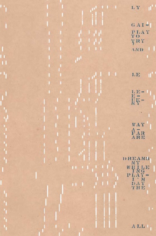 Punched paper with letterpress text. Artist unknown. Section of a piano roll. c. 1920. 16 1/2 x 10 1/2" (41.9 x 26.7 cm). The Museum of Modern Art, New York. Gift of Richard Benson. A section of a piano roll holding musical information in the perforated holes and libretto information in printed words to be read by the singer (who appears to be playing the piano). The roll moves downward as it is being played, so time is measured along its length, while bass notes are to the left and treble to the right, so musical tone is described across its width.