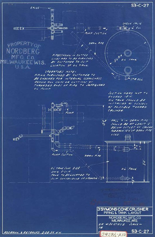 Blueprint. Nordberg Manufacturing Company, Milwaukee, Wisconsin. 3' Symons Cone Crusher: Piping & Tank Layout. 1939. 17 5/8 x 12" (44.8 x 30.5 cm). The Museum of Modern Art, New York. Gift of Richard Benson. Nordberg’s in-house identification stamp has been applied to this print at the upper left through a series of punched holes giving the company name.