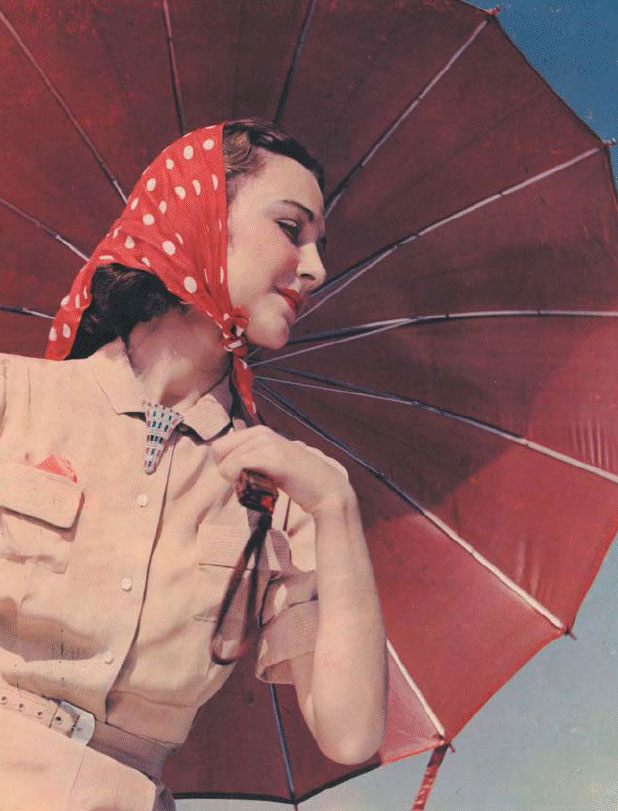 Carbro print. William Rittase. Model with Umbrella. c. 1935. 13 1/2 x 10 3/8" (34.3 x 26.4 cm). The Museum of Modern Art, New York. Gift of Richard Benson. Carbro is a more flexible descendent of color carbon printing; it uses enlarged separations. Both carbro and color carbon require careful registration of the three color layers.