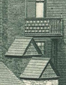 Detail of Collotype. Photographer unknown. Shingle-style house. c. 1910. 12 11/16 x 11 3/4" (32.2 x 29.9 cm). The Museum of Modern Art, New York. Gift of Richard Benson. Collotype prints were backward, reversed left to right, unless the copy negatives from which they were made were reversed through a prism. Occasionally photographers would shoot with glass plates put into their cameras backward (that is, with the emulsion facing away from the lens) to produce an original camera negative from which to make the collotype plate. The sharp clarity of the print on the previous page (detail shown to the left) makes me quite certain that that was done for this picture.