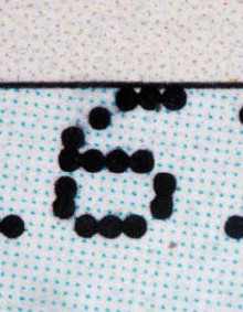 Enlargement of Web photo offset print. Light Impressions Company. Light Impressions mail-order catalog, back cover. 2006. 10 1/8 x 8 1/8" (25.7 x 19.7 cm). The Museum of Modern Art, New York. Gift of Richard Benson. © Light Impressions. The information customizing the catalog for a specific recipient has been printed on top of the conventional halftone. The coarse dots have been digitally generated, and are printed in poor register, but the numbers they display have changed for every single copy in the thousands of the edition.