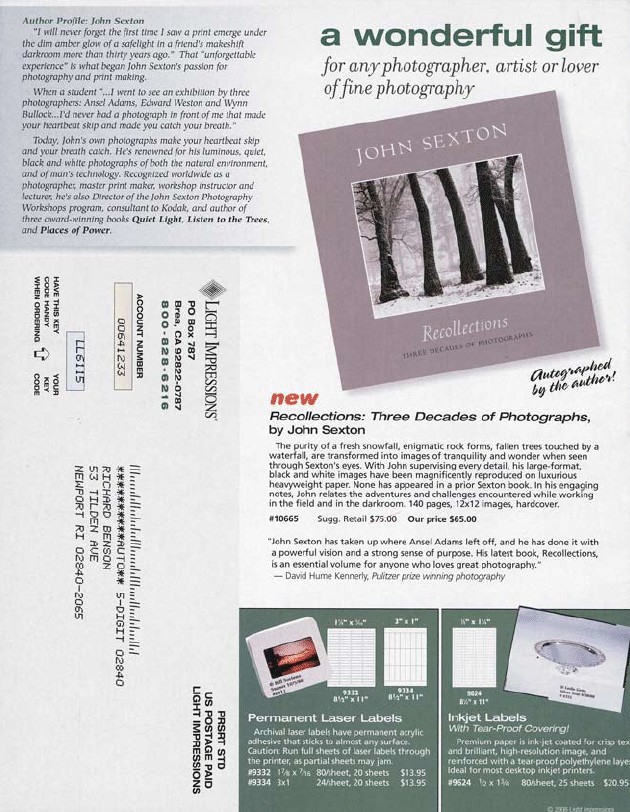 A number of businesses, instead of selling products, instead deal only in sales data, which they market to those who still sell hard goods. We are part of this web, and even though it makes us nervous we happily take advantage of its benefits. To top it all off, the cover of the catalog has a photograph on it. The history of that picture is as follows: John Sexton made a negative and printed it; the print was scanned, plated, and printed in ink as the cover of his book; that cover was then scanned, plated, and printed on the catalog; I got the catalog, scanned it, tuned it, and sent it to the printer of my own book. Even after all this, the picture looks pretty good. The union of photography, computer, paper, and press is an absolute miracle in its present state.