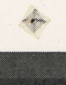Detail of Halftone duotone print. Alvin Langdon Coburn. The Spider’s Web. c. 1905. 10 1/4 x 7" (26 x 17.8 cm). The Museum of Modern Art, New York. Gift of Richard Benson. This letterpress duotone was printed with two colors: a black and a pale green. The green is nearly invisible when examined with a magnifying glass, but gives a distinct green cast to the print. The register mark, never cut off this proof sheet, shows the two inks and their respective screen patterns.