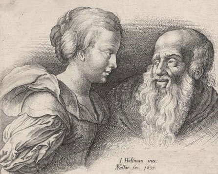 Etching. Johann Hulsman. The Elder and the Maiden. c. 1634 (Printed by Wenceslaus Hollar, 1635). 4 x 4 3/4" (10.2 x 12.1 cm). The Museum of Modern Art, New York. Gift of Richard Benson. The linear net used to emulate tone in the woodcut shows up in engravings and etchings as delicate cross-hatching.