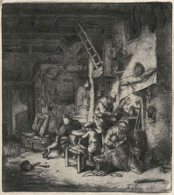 Etching with aquatint. Adriaen Van Ostade. The Family. 1647. 7 1/8 x 6 1/4" (18.1 x 15.9 cm). The Museum of Modern Art, New York. Gift of Richard Benson. This impression is a late one, made after the artist’s death. The copper plate from which it was printed was worn, and some aquatint was added to strengthen the image.