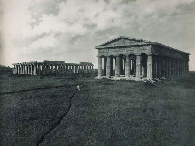 Carbon print. Edizioni Brogi. Temple of Neptune, Paestum. c. 1910. 15 3/16 x 19 11/16" (38.5 x 50 cm). The Museum of Modern Art, New York. Gift of Richard Benson. Carbon prints render photographic tone with seamless perfection. The difficulty of making them largely confined the process to professional shops, which produced large prints in significant editions. Carbon printing found its greatest use in reproducing works of art.