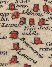 Detail of Hand-colored copper engraving. Antonius Campus. Map of the Fields of Cremona. 1579. 13 3/4 x 19 13/16" (35 x 50.3 cm). The Museum of Modern Art, New York. Gift of Richard Benson. The small red spots applied to the individual towns have been rapidly painted by a dab with a brush, for which no stencil was necessary.