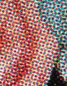 Detail of Indigo print. Impressions Digital Color. Butcher’s Tripe Range. 2006. 10 5/8 x 8 1/8" (27 x 20.7 cm). Printed by GHP (Gist/Herlin Press). 2006. The Museum of Modern Art, New York. Gift of Richard Benson. The dot used by the Indigo printer looks identical to the dot used in conventional offset lithography.