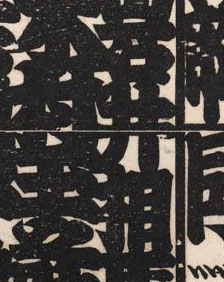 Detail of Woodcut. Artist unknown. Japanese broadside. c. 1935. 22 1/2 x 17 1/2" (57.2 x 44.5 cm). The Museum of Modern Art, New York. Gift of Richard Benson. A detail from the lower left of the print, showing the different impression from two blocks that varied somewhat in their surface. The characters to the left are from yet another woodblock.