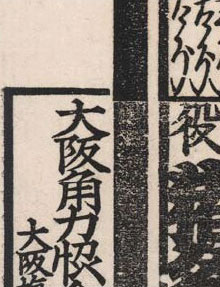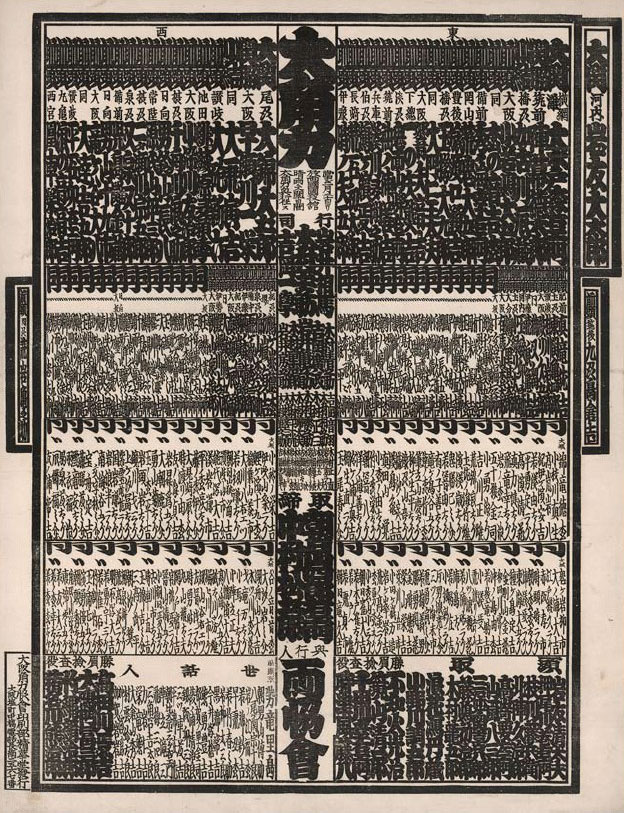 This magnificent sheet was printed in Japan sometime in the 1930s to announce the results of a wrestling match. The match took place on one day and this announcement came out on the following one. A close examination of the original shows that the print was actually made from six separate blocks. A single brush-drawn tissue was painted with the text, cut into pieces, pasted onto the different blocks, and handed to different people to do the carving. Then the blocks were held together while the impression was made. Once again the division of labor inherent in printing shows up, but this time it was done to speed the process so that the news could get out fast.