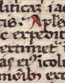 Detail from Hand lettering. Artist unknown. Page from a missal. c. 1350. 5 3/4 x 4 1/8" (14.6 x 10.5 cm) The Museum of Modern Art, New York. Gift of Richard Benson. A small manuscript page written in a southern Gothic book hand. Handwritten letters can vary according to their neighbors, and individual letters often run together. This practice gives a strong identity to the words, and reinforces the fact that letters by themselves mean nothing; content only exists when words and sentences are formed.