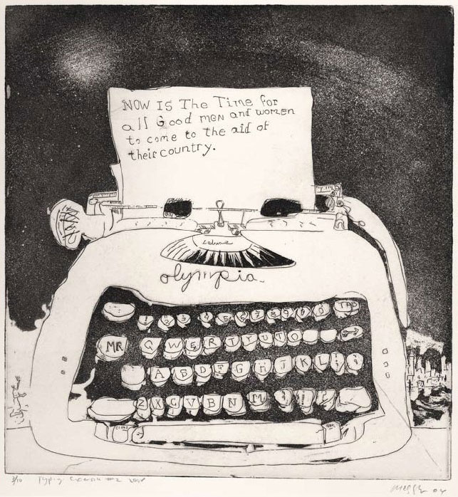 This is an etching made by my friend Sam Messer, who teaches at the Yale University School of Art. The print uses linear etching, drawn in the resist with a needle and then chemically etched, but also has large areas of aquatint, creating the darkness in the background and between the typewriter keys. Sam teaches painting and printmaking and after hours goes into the printshop at the School, where students are doing projects, and works alongside them making pictures for himself. Art education is a tough thing to do well and many of us in that trade think this is the best (and perhaps only) really good way to teach: to make your own art along with the students.