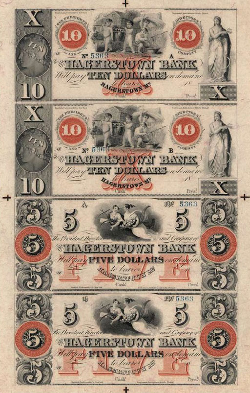 Sometimes one comes across a piece of printed paper that is pure pleasure to look at. This sheet of currency, one of the most beautiful things I own, fits nicely into our examination of multiple-impression printing. It is an uncut sheet, intaglio printed, that retains its original borders and registration marks. The bills were probably printed sometime between 1839 and 1842, because the names of two banknote-engraving companies appear on each bill, and we have records that one of the companies was created in 1839 and that they combined into a single organization, with a different name, in 1842. In the early years of the nineteenth century banks issued a huge variety of currencies, which were printed by many engravers. In 1863 the U.S. government put a stop to this and became the country’s sole issuer of paper money.