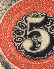 Detail of Two-color steel engraving. Danforth, Underwood & Company. Uncut banknote proof sheet. c. 1839. 12 1/4 x 7 3/4" (31.1 x 19.7 cm). The Museum of Modern Art, New York. Gift of Richard Benson. Mechanical methods capable of decorative details such as these had appeared by the mid-nineteenth century. The filigreed orange circle around the fives was engraved or etched by a pantograph working from a larger image.