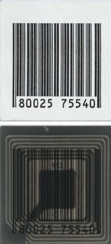 A bar code, shown at top as a reflective print and below illuminated as a transparency. This small inventory device, this one from a bookstore, contains in the dark central area a hidden picture, which, unless it is disabled during checkout, can be read electronically to alert the store that a product is being removed illegally.