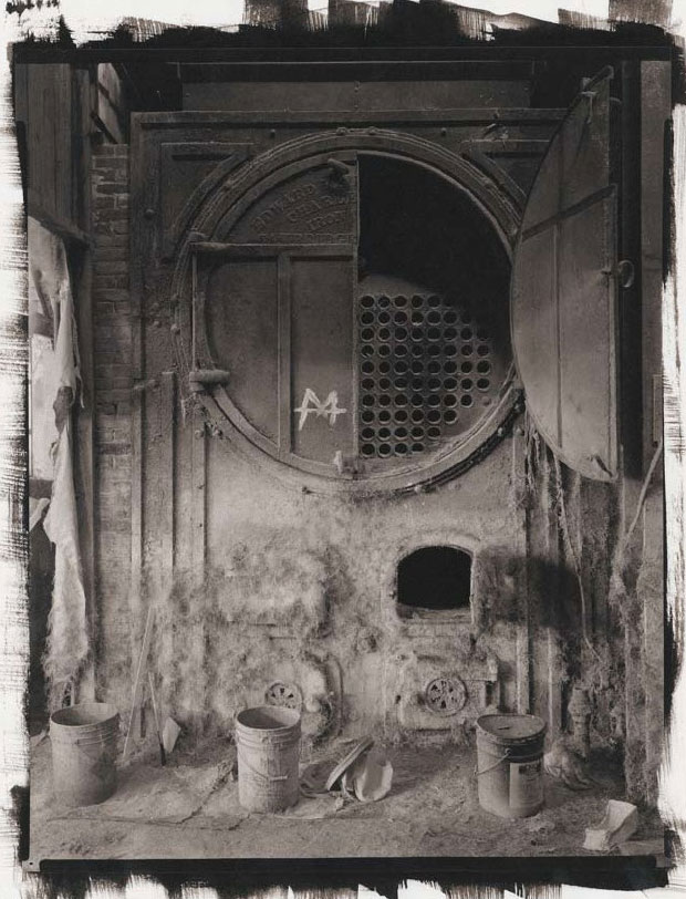 Platinum print. Richard Benson. Fall River Boiler. 1978. 16 7/16 x 13 1/16" (41.7 x 33.1 cm). The Museum of Modern Art, New York. Gift of Richard Benson © Richard Benson. This print is untrimmed, showing the brushmarks made when the sensitive iron/platinum coating was applied to the sheet of Crane’s stationery that was the basis for the print.