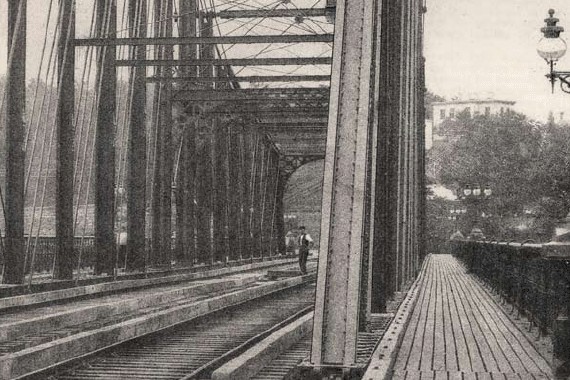 The picture was obviously derived from a photograph—it has the rigid perspective that could only have been drawn by a wide-angle lens. It also has an odd background of trees and sky that would never have been described this way by an artist making an original work; the trees running along the midline of the picture are a nearly amorphous blob of middle tones—not the sort of thing one would have created intentionally. To top it all off we have a tiny man standing on the bridge, just to the left of the girders on the right side of the superstructure. From photography’s earliest days figures were placed in pictures to demonstrate the scale of the thing being photographed.