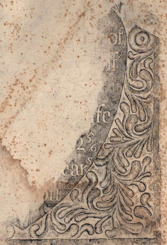 The most basic pictorial analog is the rubbing. Since I come from a stone-carving family I can’t resist illustrating one made from an early American tombstone. The letters and floral border are beautifully described, and the picture has that marvelous characteristic of only showing part of the original, like some Greek sculptural fragment where the arms and head tantalize us with their absence. This sheet also has a great patina of brown spots running across the surface and there is even a large water stain on the bottom edge. All in all it makes a great picture, and does so by transmitting information from the original carved stone into a new context: the meaningless degradation of the paper support. The artists among us should always be cautious about letting such beautiful haphazard patterns coexist with intended meaning.