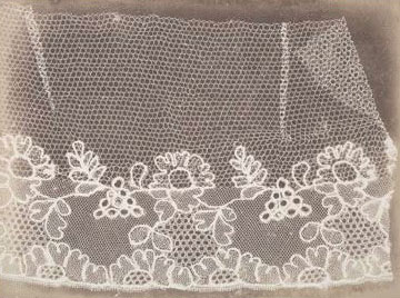 The first paper photographs were contact prints of objects. The small Talbot print of lace that we see to the left, made in 1845, is a negative image, made by pressing the lace against a sensitized sheet of paper. Where the lace blocked the light, no silver deposit was formed; in other areas, where light struck the paper, it darkened. By a happy coincidence, the lace, white but opaque, looks like a positive in this reversed print.
