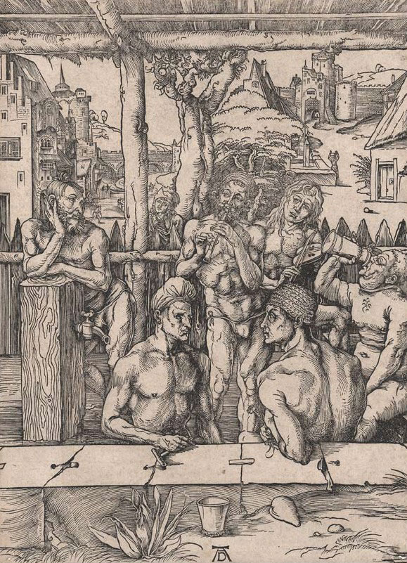 Woodcut. Albrecht Dürer. The Men’s Bath. c. 1496. 15 7/16 x 11 3/16" (39.2 x 28.4 cm). Collection of John Benson.
