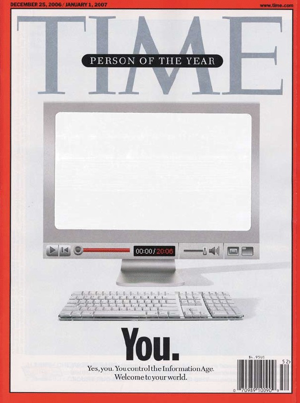 Web photo offset lithography. Arthur Hochstein (designer) and Spencer Jones-Glasshouse (photographer). Cover of Time magazine, December 25, 2006/January 1, 2007. 10 7/16 x 7 7/8" (26.5 x 20 cm). The Museum of Modern Art, New York. Gift of Richard Benson. Courtesy the Editors of Time Magazine © Time, Inc. This cover, printed by web offset, has an aluminized plastic mirror stuck on in the monitor area, intended to reflect the reader’s face.