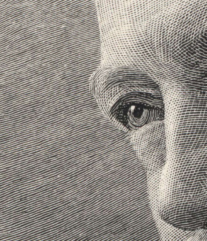 (list continued from previous page) (4) The finished block was locked up with type in a chase. (5) This composite was used to generate a stereotype (a thin metal replica, shaped to fit a cylinder), and (6) this plate, along with a group of others, was mounted on the cylinder of a rotary printing press, to be printed at high speed for use in the magazine The Century. This detail of the previous plate, enlarged eight times from the size of the actual wooden block, shows the extraordinary network of lines that was hand engraved with no tools other than the guide photograph, a handheld burin, and a magnifying glass.